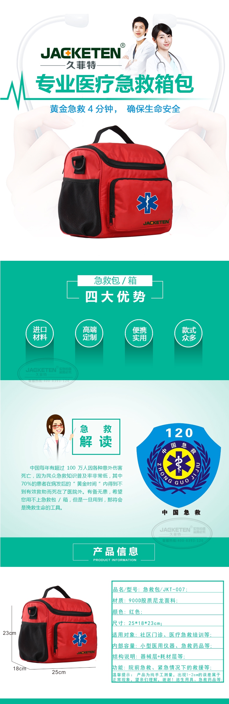 品名/貨號:急救包/JKT-007;材質:900D股質尼龍面料;顏色:紅色;尺寸:25*18*23cm;適用對象:社區(qū)門診、醫(yī)療急救培訓等;內部容量:小型醫(yī)用儀器、急救藥品等;結構說明:器械層+耗材層;功能:院前急救、緊急情況下的救援等