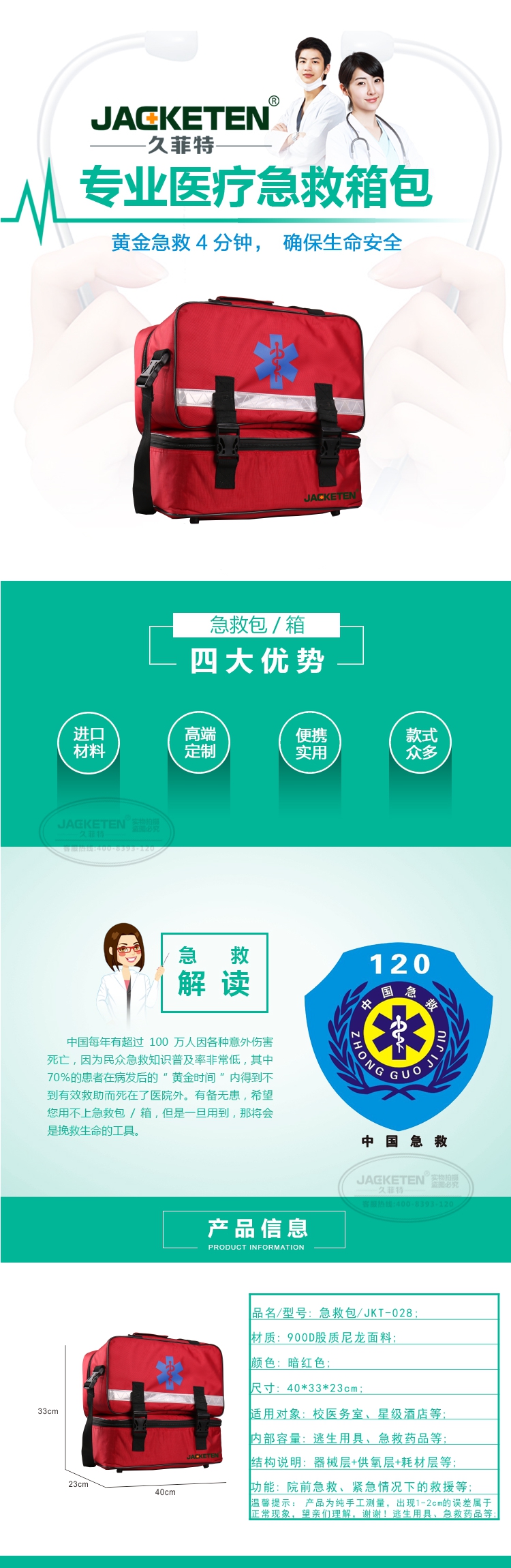 品名/貨號:急救包/JKT-028;材質(zhì):900D股質(zhì)尼龍面料;顏色:暗紅色;尺寸:40*33*23cm;適用對象:校醫(yī)務(wù)室、星級酒店等;內(nèi)部容量:逃生用具、急救藥品等;結(jié)構(gòu)說明:器械層+耗材層;功能:院前急救、緊急情況下的救援等